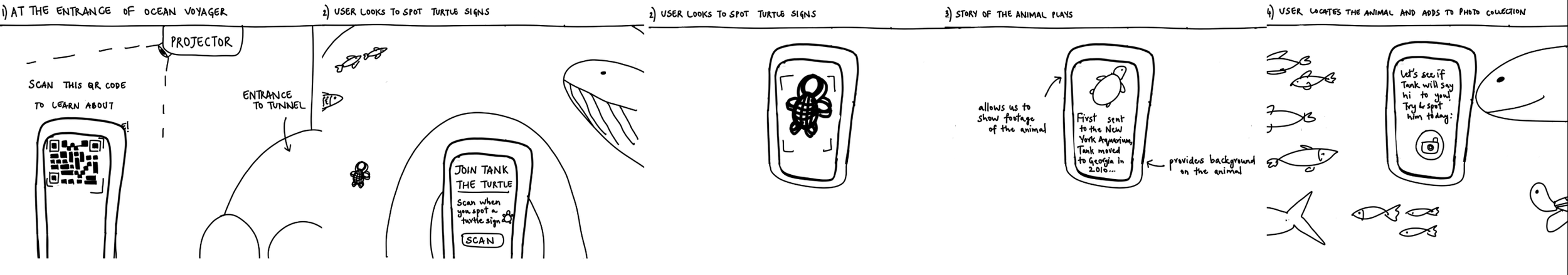 Can bring attention to overlooked species at the aquarium (DI 03). The sketch follows a user as they track the life journey of a turtle. This narrative storytelling may build empathy (DI 05).